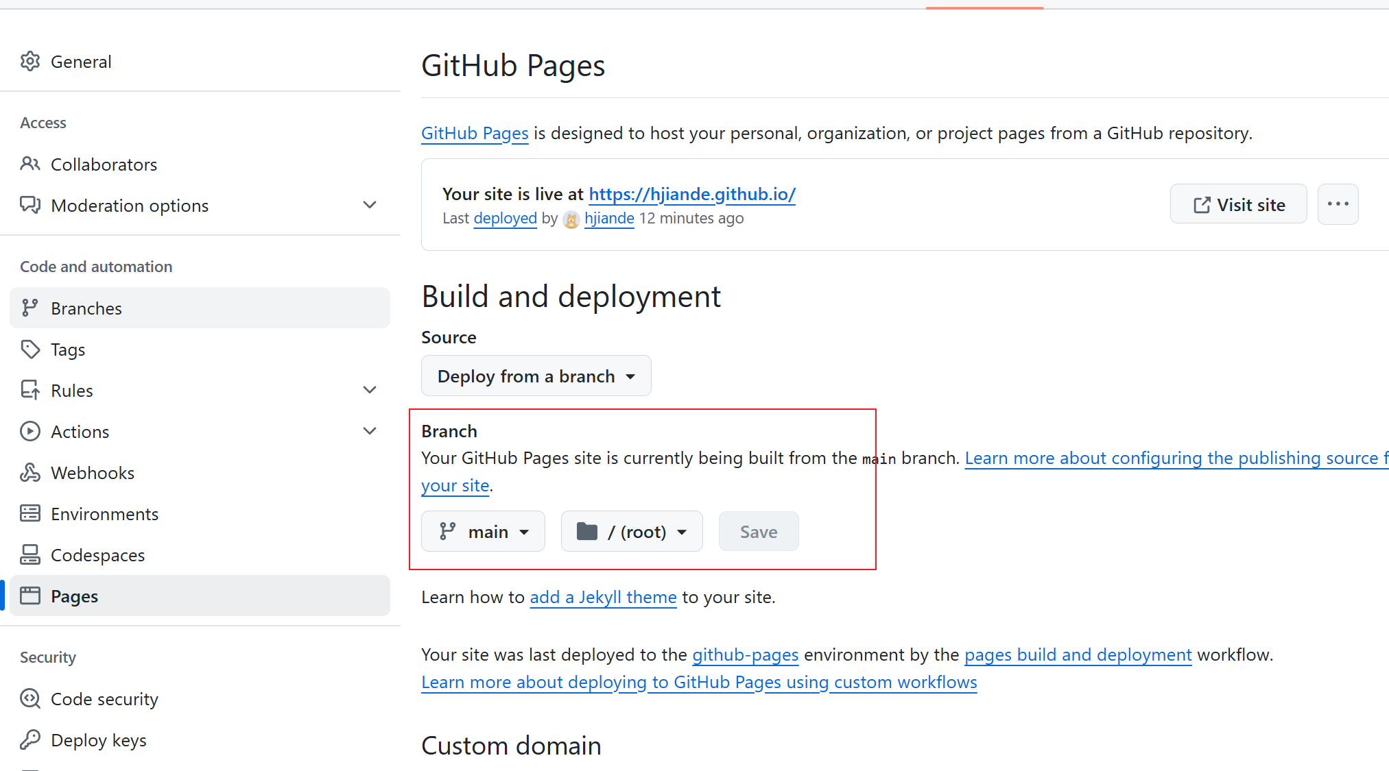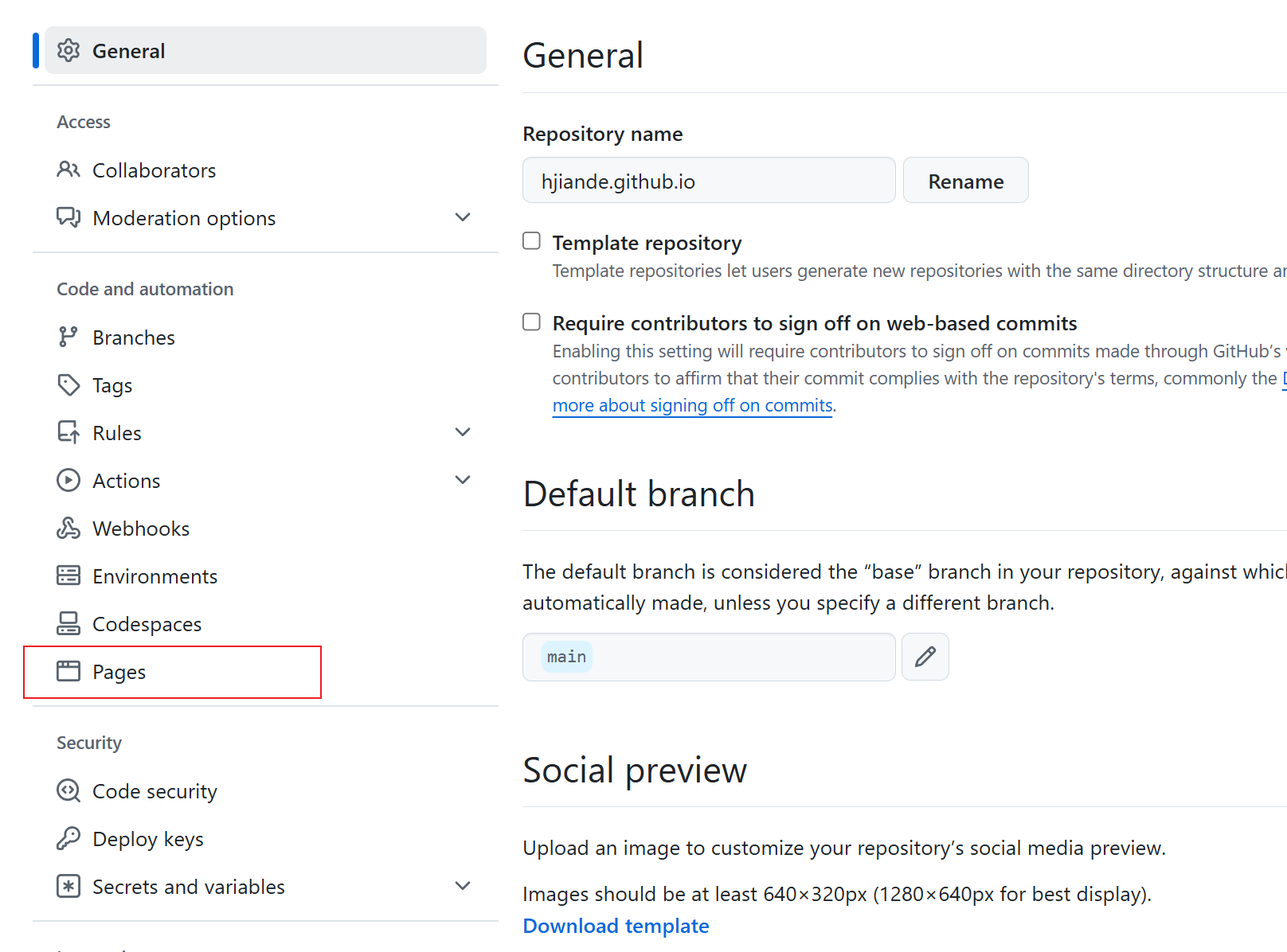 创建完成后,进入到仓库的设置界面的Pages选项,将branch:main设置为当前活动分支: